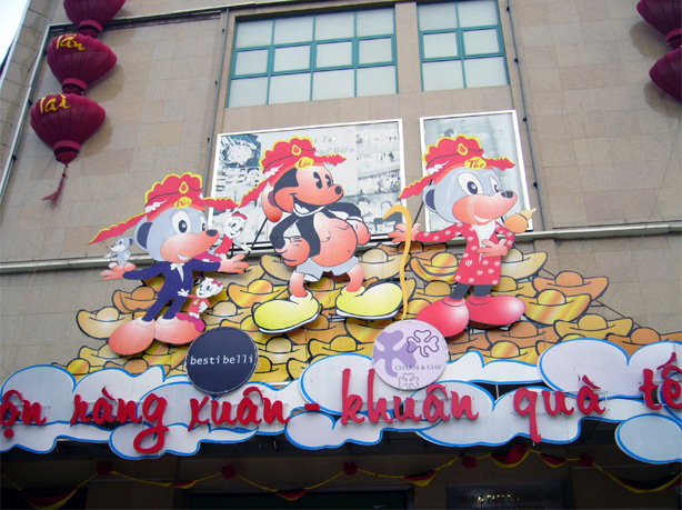 街中に『Chúc Mừng Năm Mới』と書かれた赤い垂れ幕がかかり、