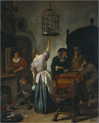 「オウムに餌をやる女、バックギャモンをする二人の男と他の人物たち」